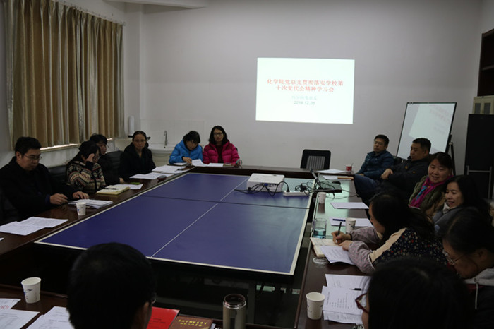 12月26日,化学院党总支召开“贯彻落实学校第十次党代会精神学习会”。学院党政领导、学校第十次党代会代表、全体教工党员、学生党员代表参加会议。会议由化学院党总支书记王德宝主持。